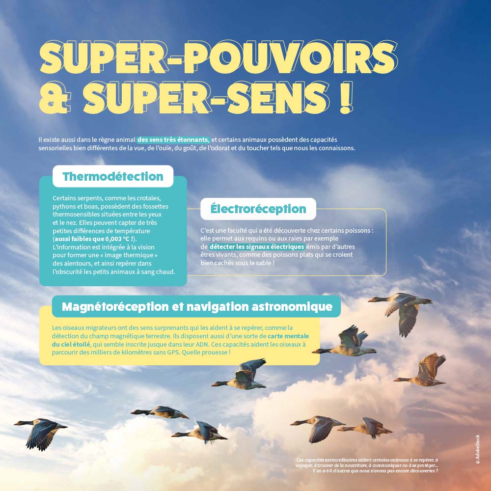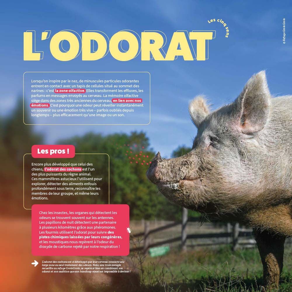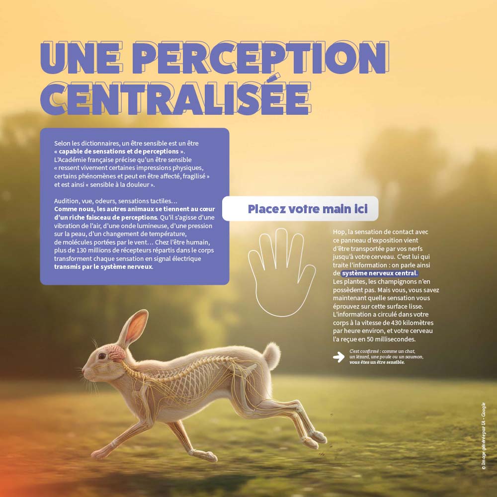 Comme nous, les animaux ressentent. La lumière, les sons, les goûts, les odeurs, les caresses, la douleur, et bien d’autres choses encore ! Par un voyage interactif à travers les sens, cette nouvelle exposition invite aussi à découvrir comment la sensibilité des animaux est prise au sérieux par les sciences, par les philosophes, par certaines lois qui protègent les animaux, et par les personnes et les associations qui les défendent au quotidien. Comment le fait que les animaux ressentent engage-t-il notre responsabilité ?